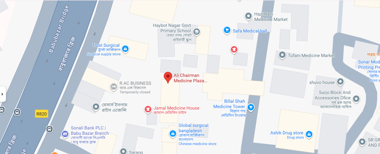 আলী চেয়ারম্যান মেডিসিন কর্নার স্কয়ার (নীচ তলা) ৯নং হায়বৎ নগর, দেওয়ান সাহেব লেন, বাবু বাজার, ঢাকা- ১১০০। ( দোকান নং – ২২